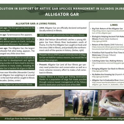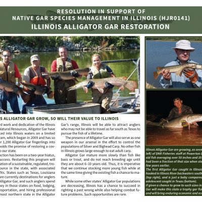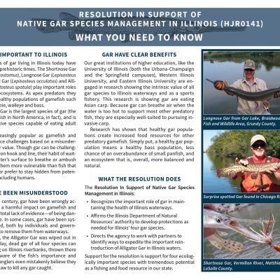 In 2016 I was involved in the writing and promotion of a pro-gar resolution that passed unanimously in both the Illinois House and Senate. As part of the lobbying process, I wrote and designed a pair of information sheets that we could give senators and representatives who were unfamiliar with the fish in general and the issues in particular. Famed fish artist Joe Tomelleri generously allowed me to use his gar images. A blog post I wrote on the subject: http://moxostoma.com/illinois-gar-management-resolution/