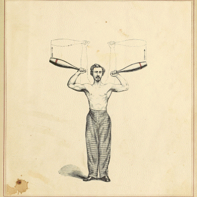 The animation of the man/men doing exercises with what look like bowling pins comes from illustrations in an 1866 book on archive.org: The Indian club exercise: With explanatory figures and positions (etc.). I would have made an animation of the “Exercises for Ladies,” but the ladies only get a couple.