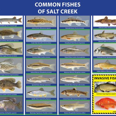 The Fishes of Salt Creek poster was created for display at a Meet the Creek event in the town where I live. For decades it had a reputation of being polluted and devoid of life. As pollution sources have been eliminated and restoration has progressed, however, it has rebounded impressively. Local residents are stunned to see just how many species now call the creek home. The poster is displayed next to several aquariums filled with fish of numerous species, all collected in the creek the day before the event.