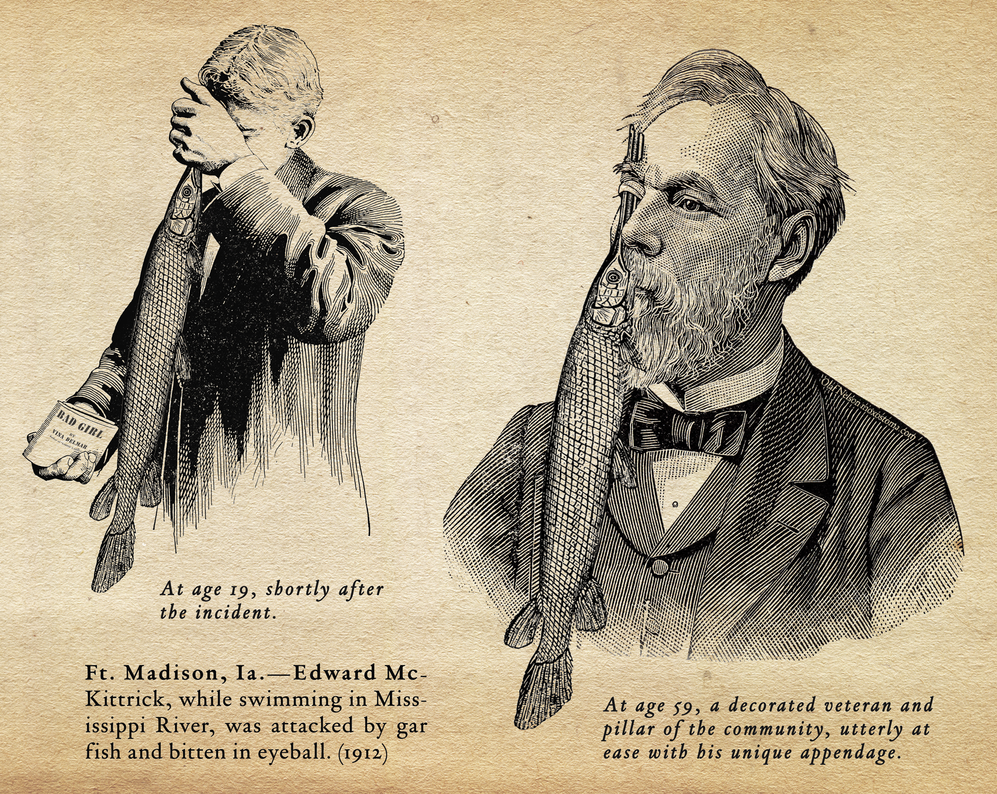 I made the illustration of the man with the gar in his face after finding a 1912 newspaper account of a young man “attacked by gar” in the Mississippi River. Read about it, and him, at http://moxostoma.com/gar-peril-iowa-1912/ Some people believed it to be real, so I added a disclaimer.