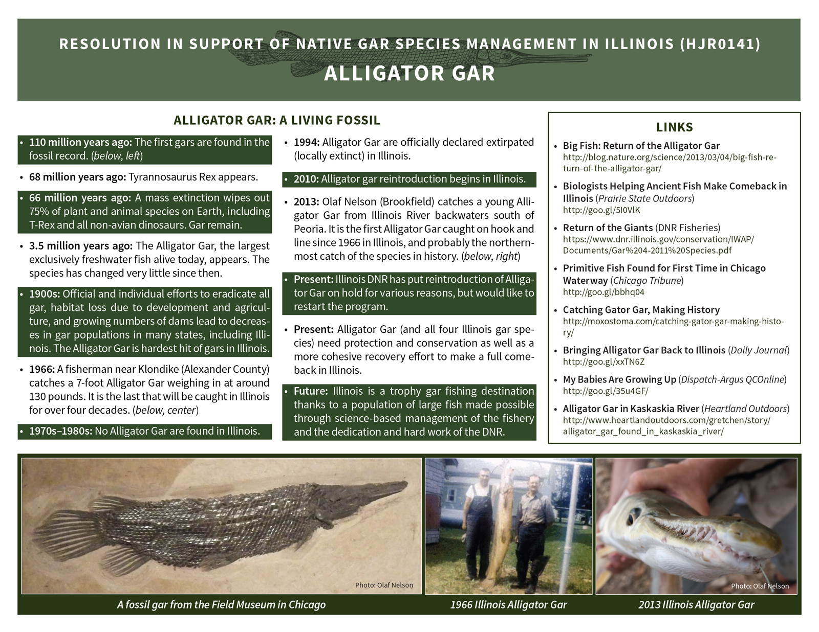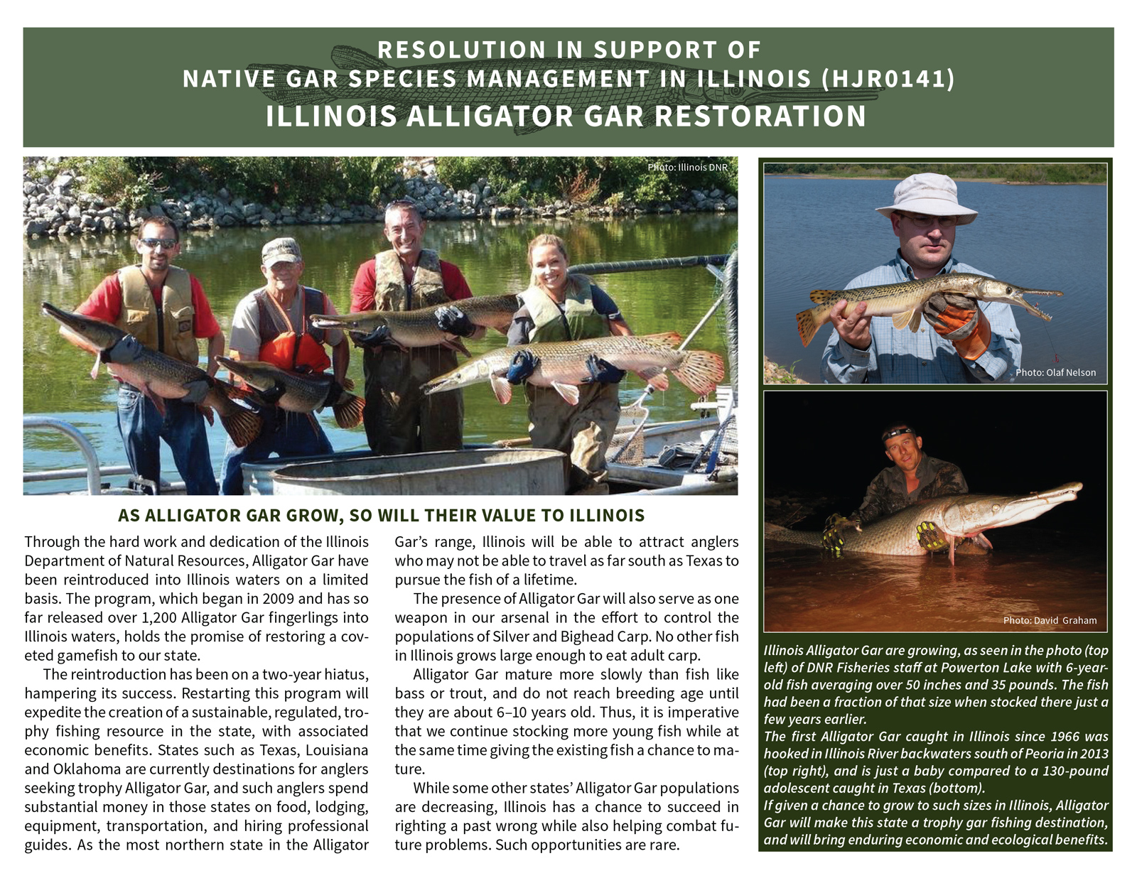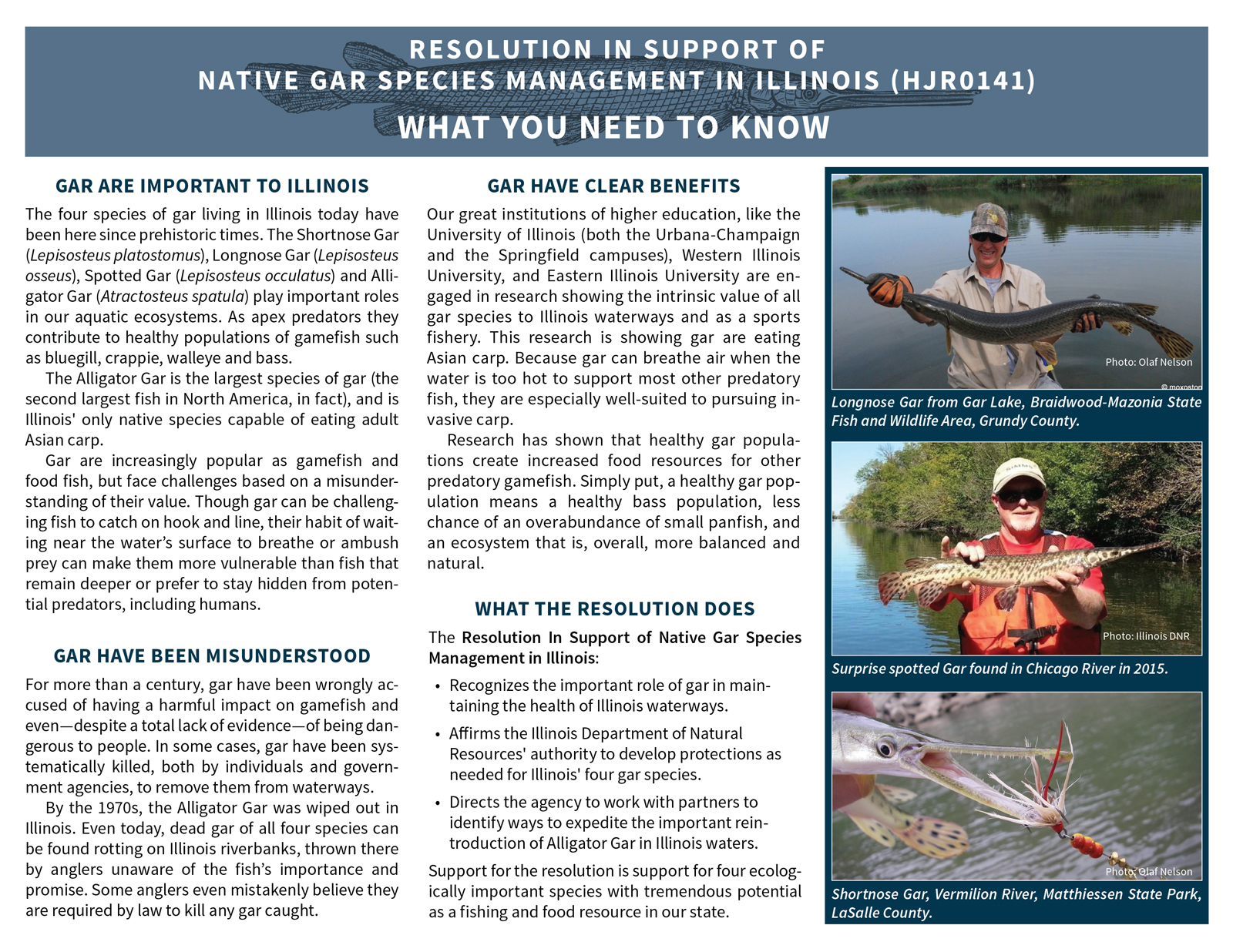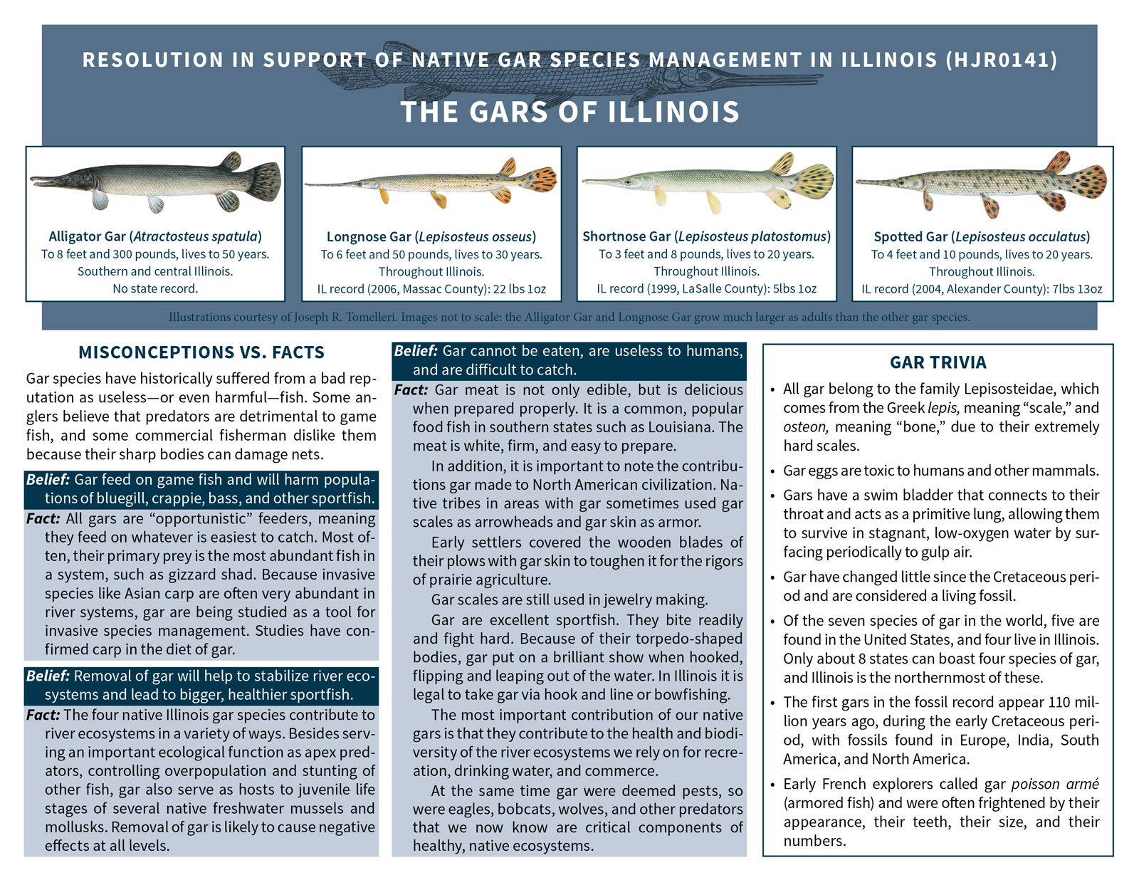 In 2016 I was involved in the writing and promotion of a pro-gar resolution that passed unanimously in both the Illinois House and Senate. As part of the lobbying process, I wrote and designed a pair of information sheets that we could give senators and representatives who were unfamiliar with the fish in general and the issues in particular. Famed fish artist Joe Tomelleri generously allowed me to use his gar images. A blog post I wrote on the subject: http://moxostoma.com/illinois-gar-management-resolution/