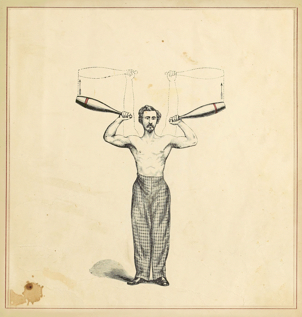 The animation of the man/men doing exercises with what look like bowling pins comes from illustrations in an 1866 book on archive.org: The Indian club exercise: With explanatory figures and positions (etc.). I would have made an animation of the “Exercises for Ladies,” but the ladies only get a couple.
