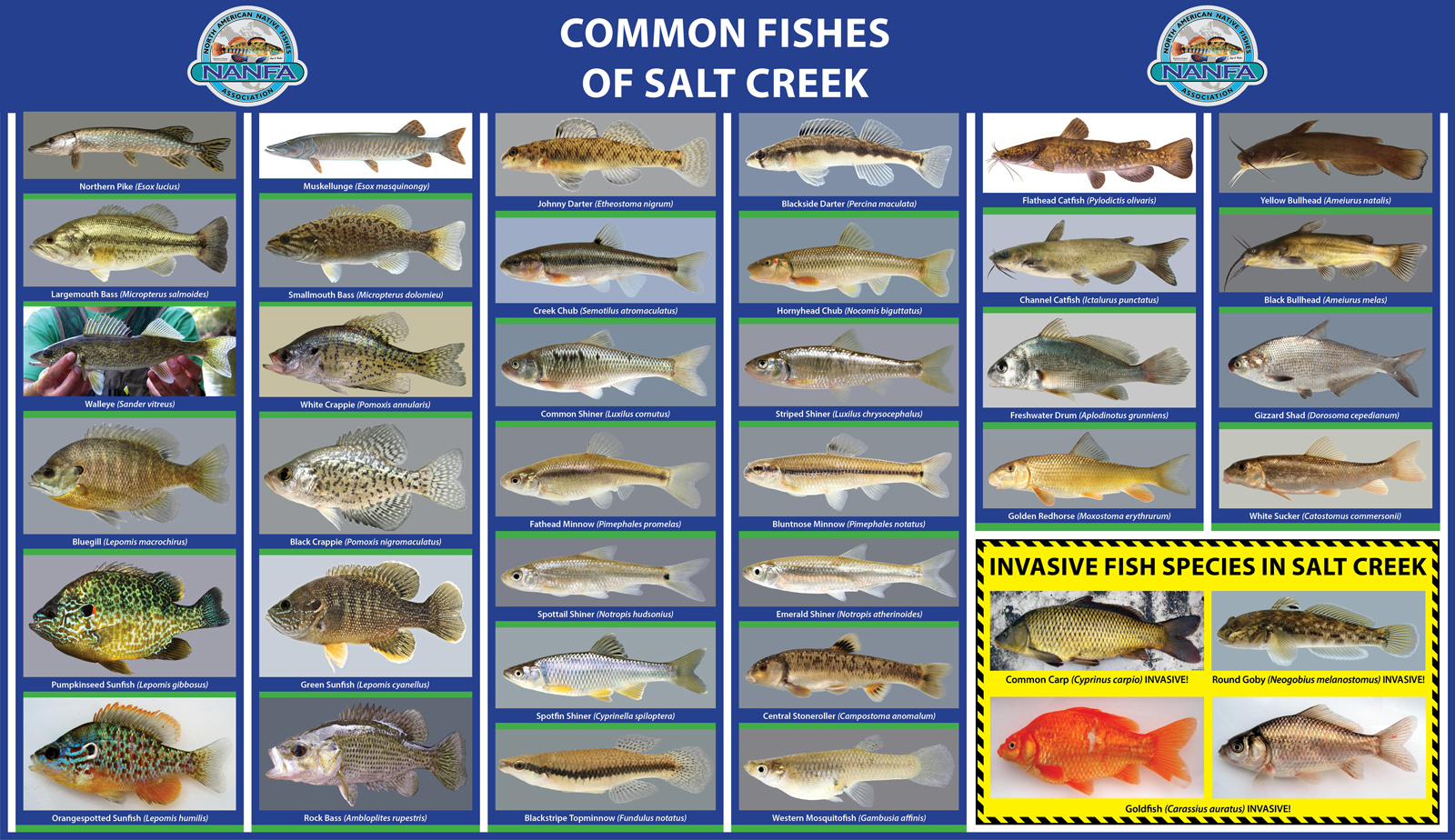 The Fishes of Salt Creek poster was created for display at a Meet the Creek event in the town where I live. For decades it had a reputation of being polluted and devoid of life. As pollution sources have been eliminated and restoration has progressed, however, it has rebounded impressively. Local residents are stunned to see just how many species now call the creek home. The poster is displayed next to several aquariums filled with fish of numerous species, all collected in the creek the day before the event.