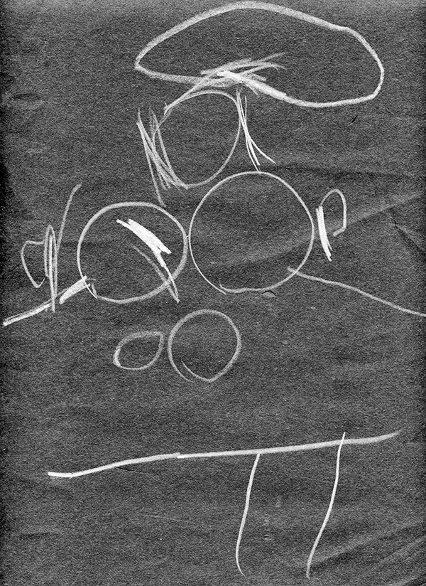 Greta drew the Book Monster for me in 2008. She was 3. Its arms come out of its eyes and its legs come out of its mouth. Its nostrils are pretty much normal, if not symmetrical. It’s wearing a hat on its head, and its eyes are actually below its head, which is featureless except for hair.